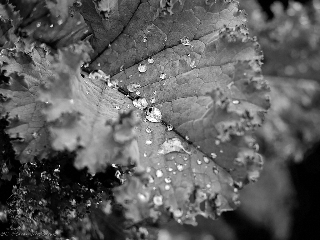 One of neighbors, whose street side garden you've often seen highlighted here, still has some sort of ornamental cabbage growing strong. The purple and green just felt a little over the top, so I have rendered it in monochrome to bring out the raindrops that rest on the leaves.